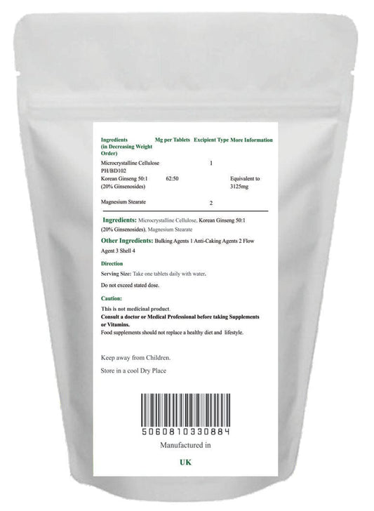 KOREAN GINSENG 30 Tablets 3125mg May improve libido/sex Vegan/Vegetarian